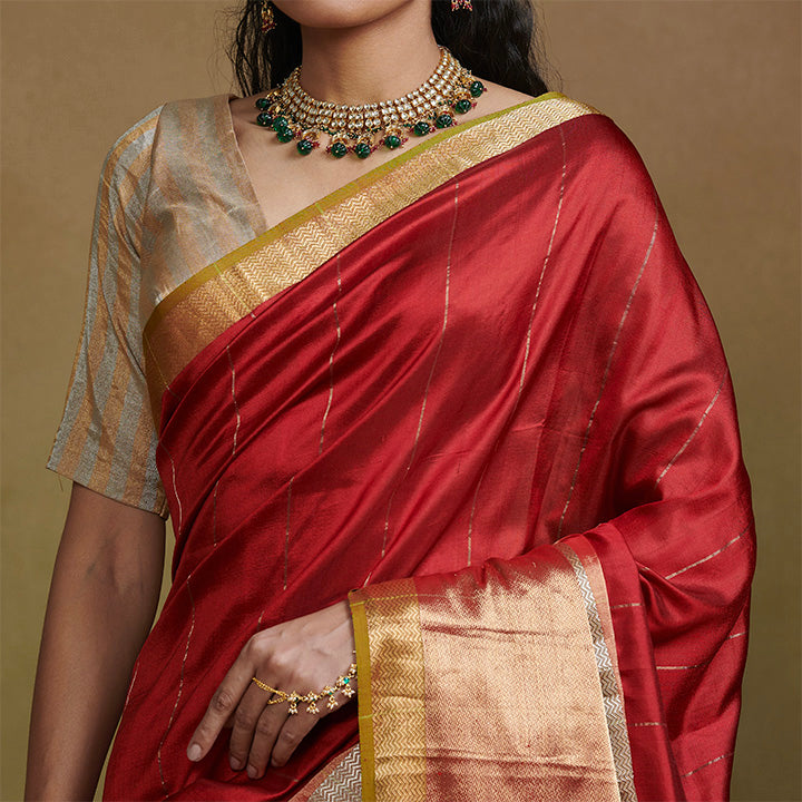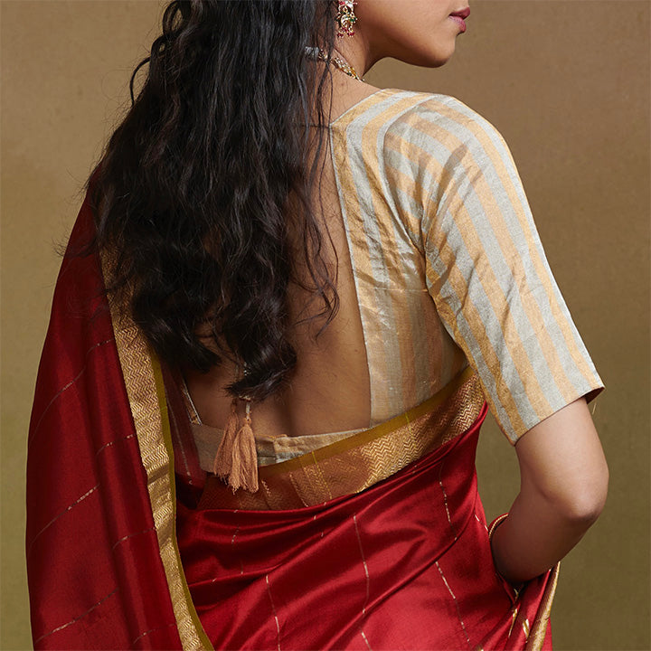 A modern reincarnation of classic stripes, this handwoven golden and silver Zari blouse adds a touch of everyday luxury.