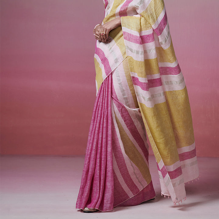 Crafted in pure natural linen, each saree boasts of gentle imperfections that set these sarees apart. With an interplay of lustrous smoothness and textural coarseness, every linen saree celebrates nature's artistry, skillfully transformed into a wearable masterpiece.