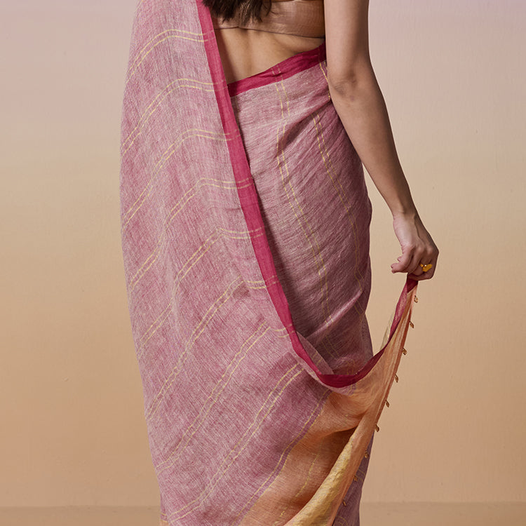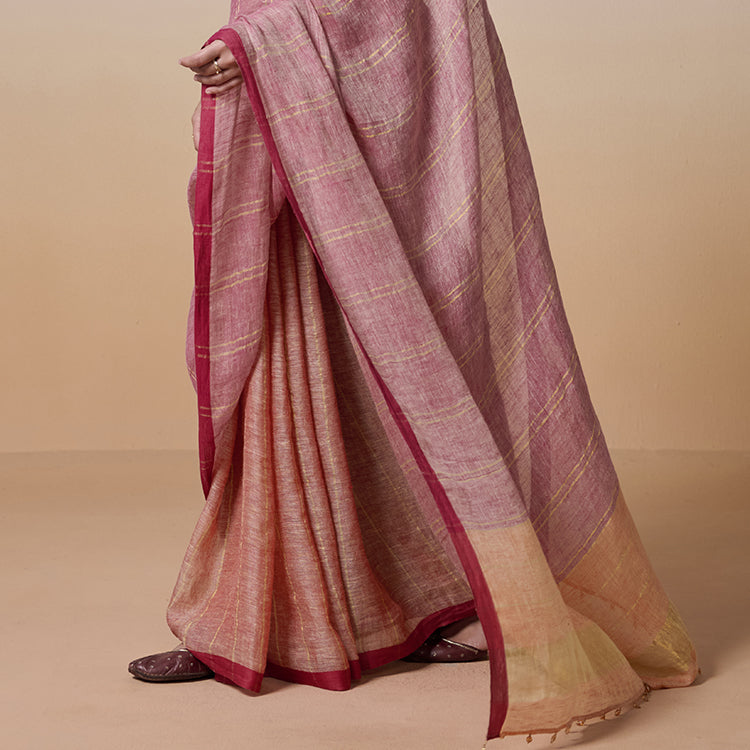 Dual-tone elegant linen saree in pink & orange with zari on pallu