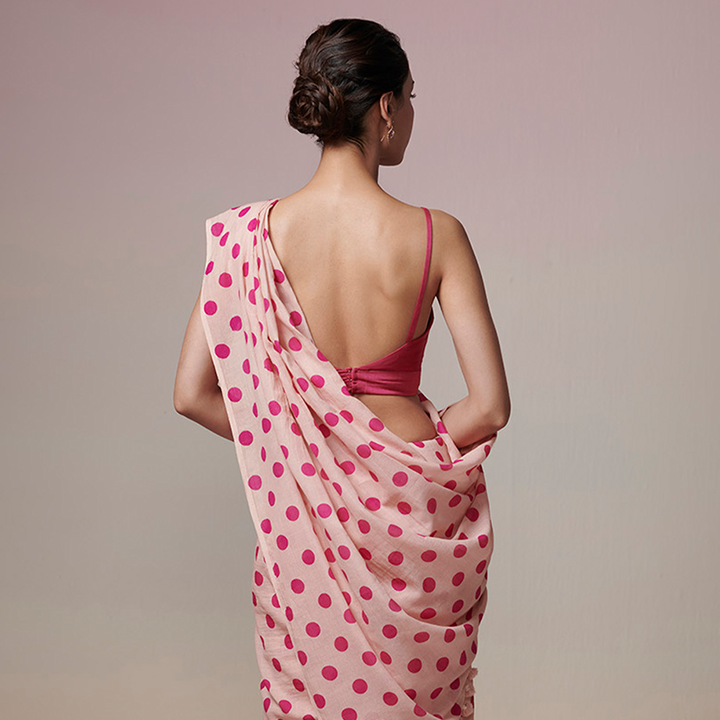 Our Malini Blouse is a chic spaghetti-style addition to your wardrobe. In a soft pink hue crafted from Chanderi fabric, Malini blends elegance with comfort. Padded with lining, it ensures a flawless fit and effortless style for any occasion.
