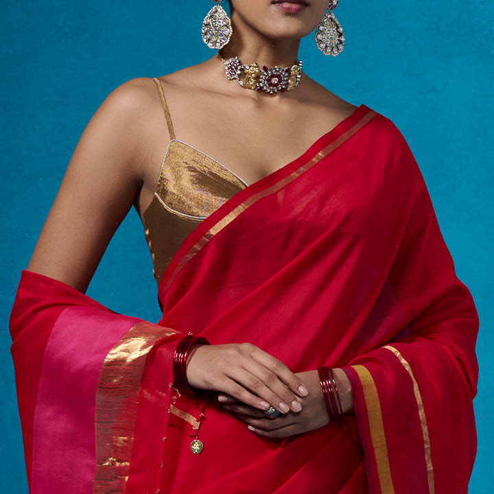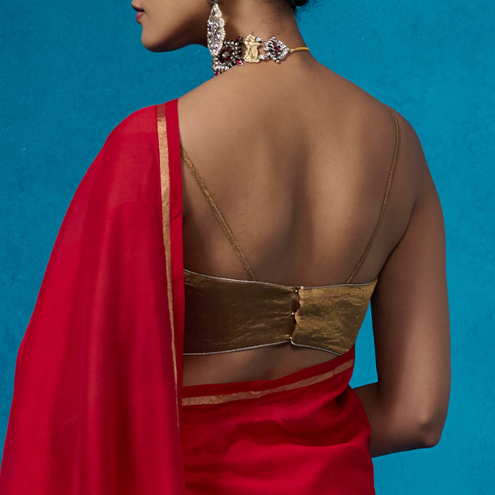 Experience the luxury of tissue fabric from Chanderi with the 'Mannat' blouse. Delicate spaghetti straps and a fashion-forward look are complemented by silver tissue piping set against its deep gold color.