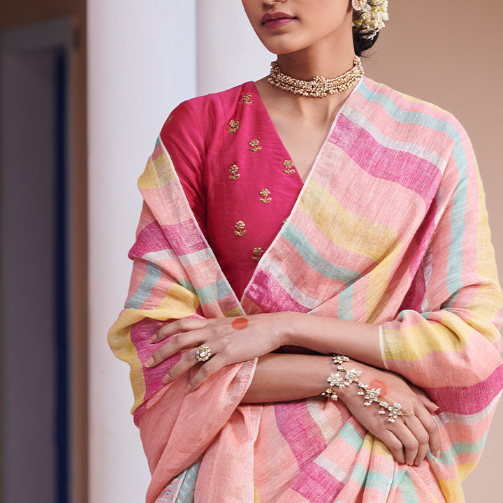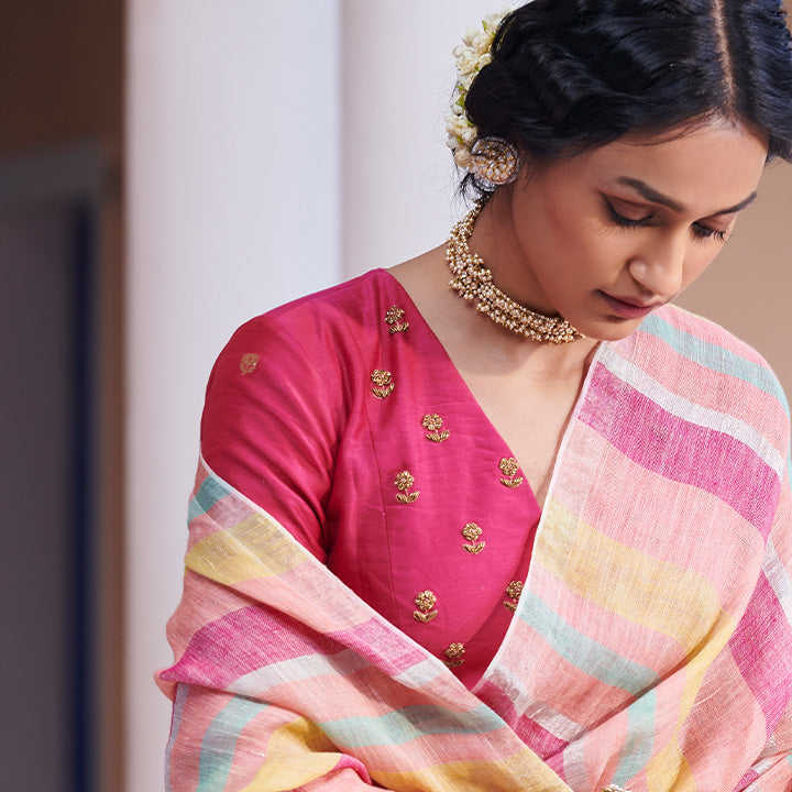 A classic v-neck blouse handwoven in Silk cotton and crafted to perfection. This pink blouse with intricate embroidery serves to be the most versatile ancillary in your wardrobe.