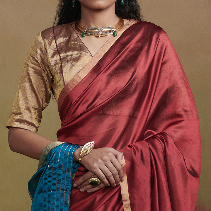 The golden-colored Navrasa, crafted in handloom Chanderi tissue fabric exudes elegance of celebrations, making you stand out with its shine.