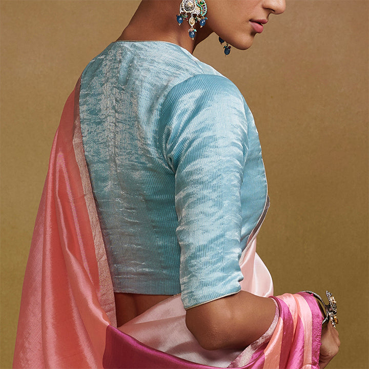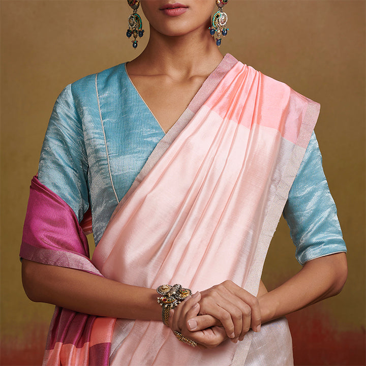Nirupama is a blouse woven on the looms of Chanderi in handloom silk. Featuring tissue detailing, this light blue blouse is an ideal choice to elevate your signature style.