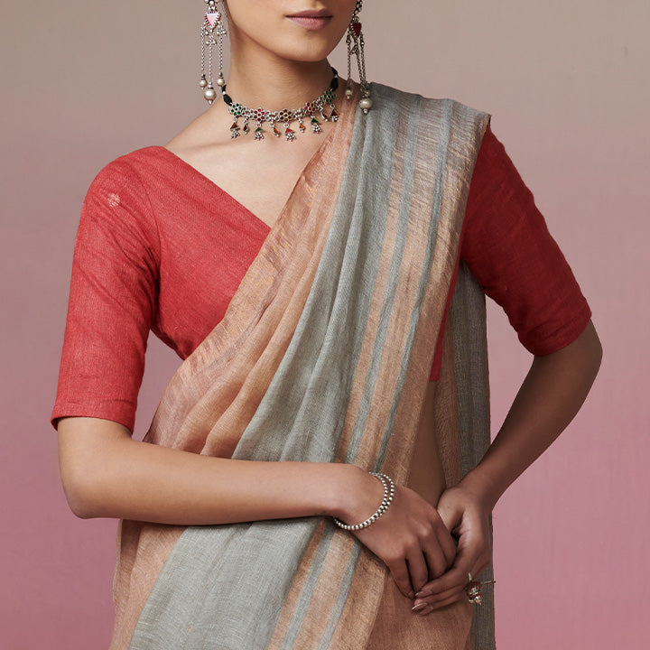 This handwoven linen blouse, adorned with delicate polka Jamdani motifs, is a treasure-worthy addition to your wardrobe. The striking red hue enhances its exquisite craftsmanship, making it a timeless piece of refined elegance.