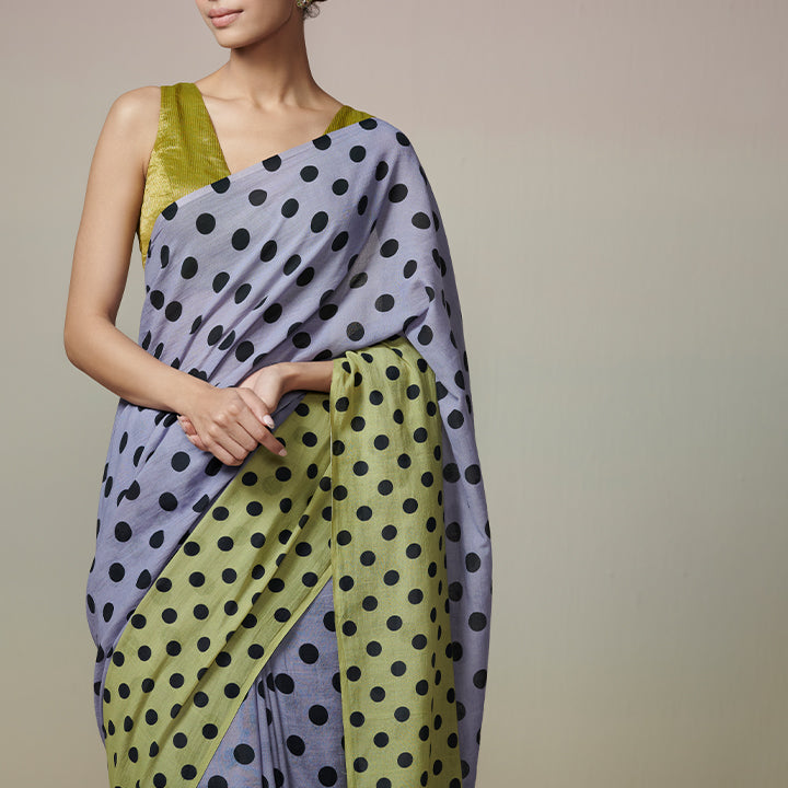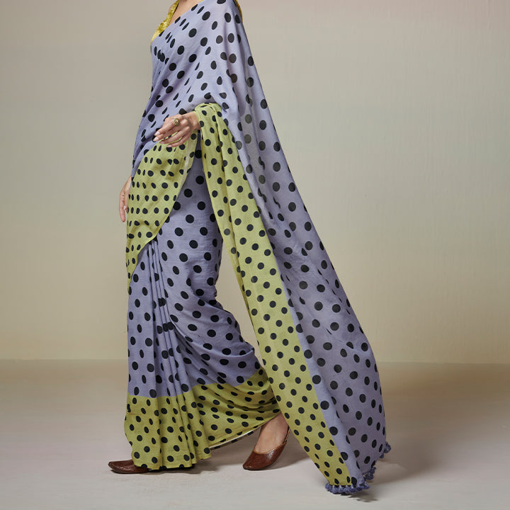 This saree holds the essence of a Rosemary flower. Feel effortlessly comfortable in this versatile saree with black polka dots adding a retro feel to the saree.