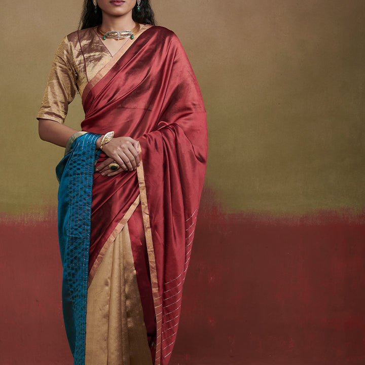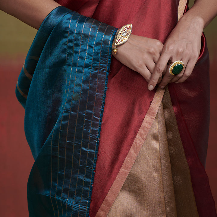 Craft a unique style with 'Sahiba,' a handloom Chanderi silk saree, showcasing bold colour blocking. Adorned with a peacock blue palla, elegant glass beadwork, and Dressfolk coins, it's the perfect choice for timeless elegance on any occasion.
