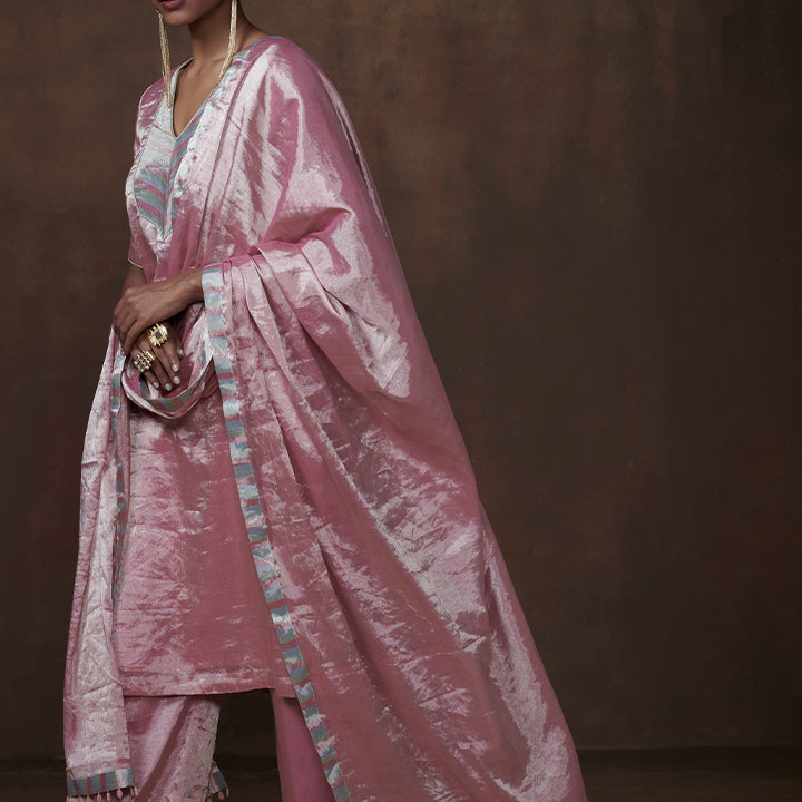 Elegance meets modern charm in our exquisite Shafaq kurta and pant set. This enchanting ensemble is crafted with utmost finesse using handwoven tissue fabric, making it a perfect choice for every fashion-forward woman. Embrace a soft and luxurious feel as you slip into this this stunning pink kurta and pant set.