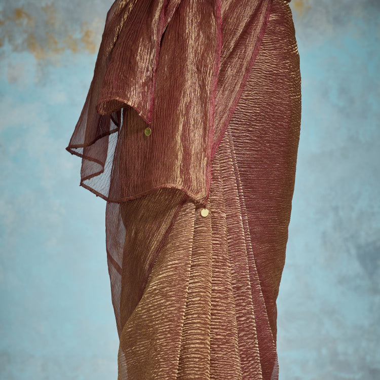 'Sindoori' embodies the colour of auspiciousness. A striking maroon over a subtle gold zari base gives this saree a luxe and radiant appeal. The palla features handmade glass beads and the signature Dressfolk coin, making it perfect for celebrations.