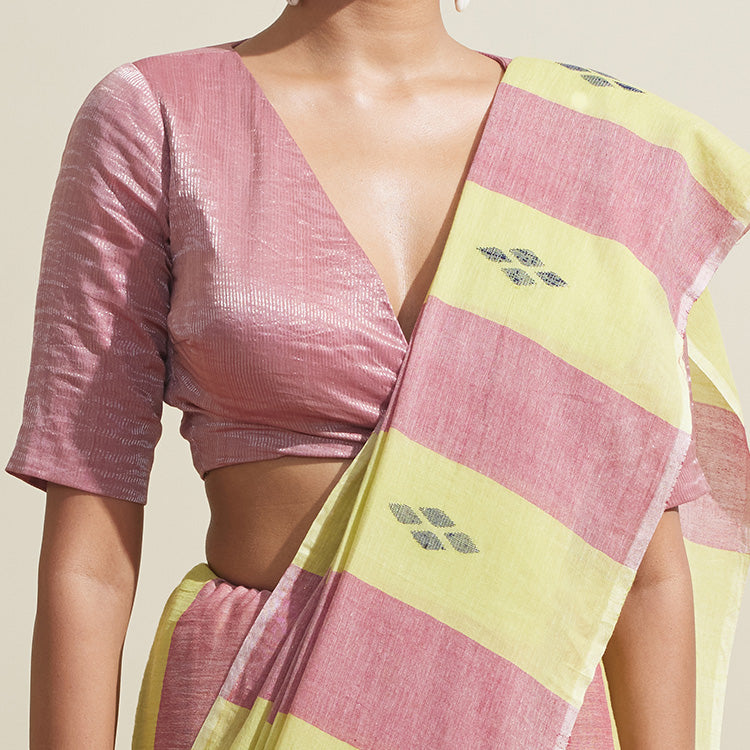 Tailored in old rose striped Chanderi, this blouse brings understated elegance with its V-neck overlap design and soft sheen — ideal for both casual and festive wear.