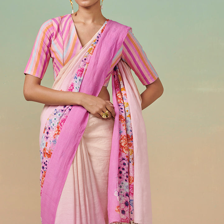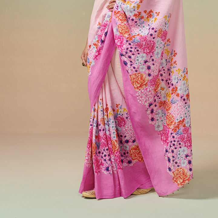 Pink ombré floral print linen saree