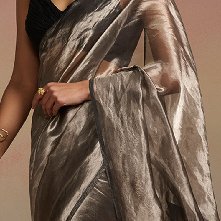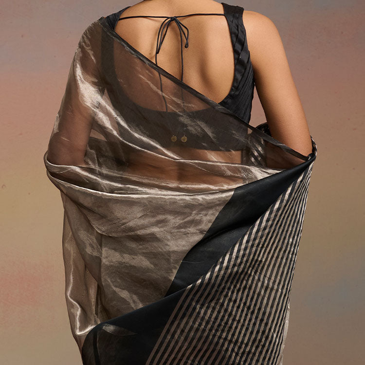 A metallic silver tissue saree with a soft black undertone. The pallu features subtle black stripes along with a Dressfolk signature charm and fine glass beads. Perfect for festive evenings, weddings, or celebratory dinners.