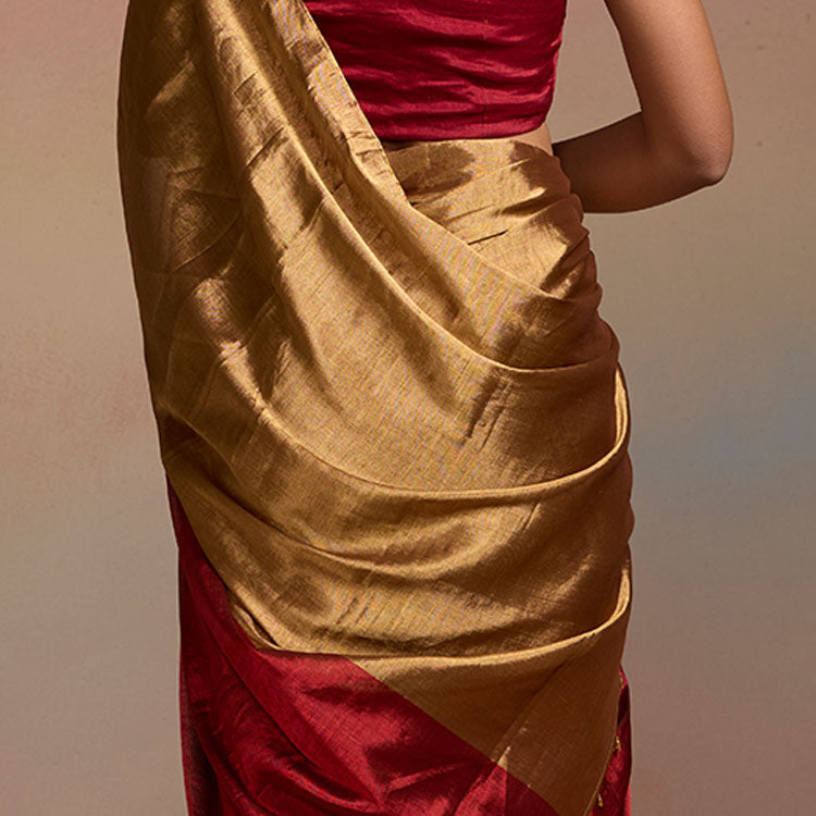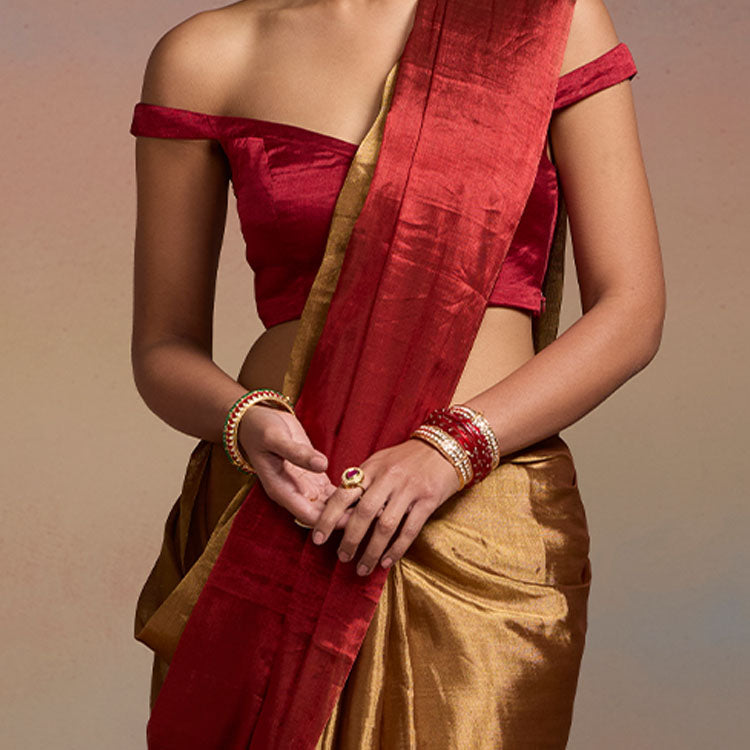 A bold half-and-half blended red and gold saree that creates a striking, luminous statement. The metallic tissue gleams with festive radiance, making it ideal for celebrations, rituals and weddings. The pallu is detailed with a Dressfolk signature charm and fine glass beads that add an elegant and authentic touch.