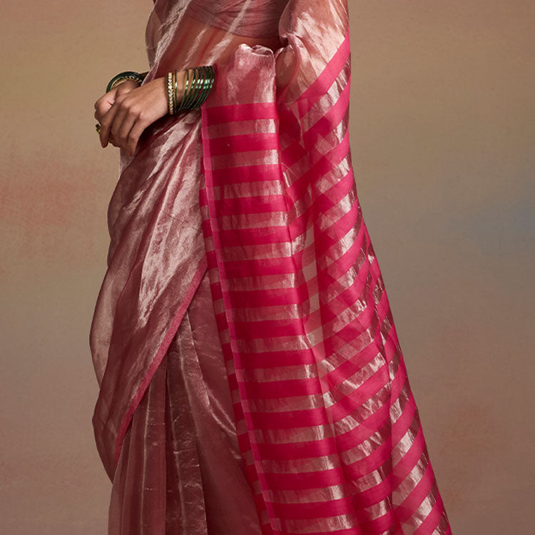 A soft pink tissue saree with delicate silver undertones. The pallu is enhanced with subtle pink stripes and a Dressfolk signature charm with glass beads, adding a delicate authentic touch. Perfect for festive gatherings and intimate celebrations.