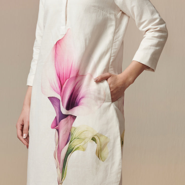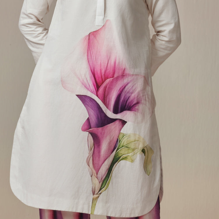 Elevate your wardrobe with relaxed-fit kurta set. With its striking motif and chic striped trousers, "Anusha" set exudes polished elegance, whether you are heading to work or any evening event.