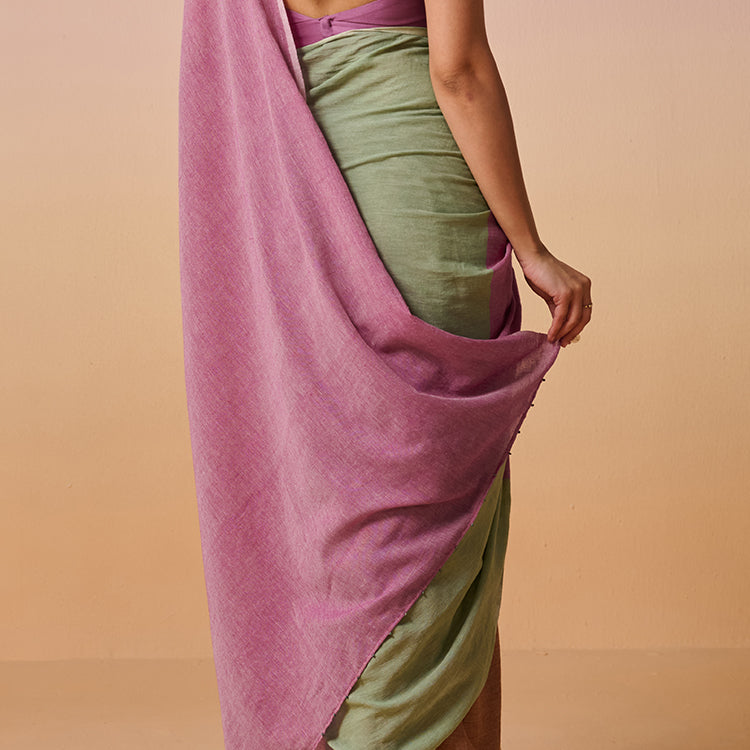 Inspired by its namesake raga, and envisioned with the beauty of a meditative early morning, this colour block saree is a striking yet subtle addition to the wardrobe. Featuring a harmonious blend of brown, green, and purple, Asavari creates a cohesive visual appeal, making for an ideal ensemble for casual and festive outings, both.
