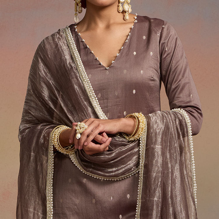 A straight metallic grey kurta in Brocade paired with Chanderi silk pants. The floral motifs and subtle shimmer create a refined statement while keeping you comfortable all day. Soft, elegant, and structured, this set is ideal for festive gatherings or wedding rituals.