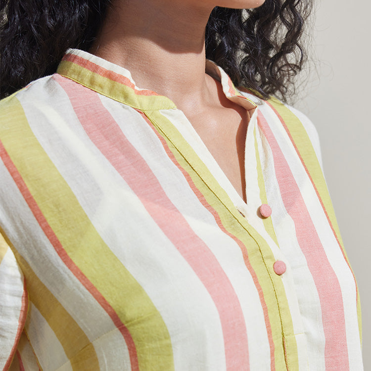 Inspired by morning rituals and warm cups of chai, Café Kolam captures the calm of everyday elegance. Striped handwoven cotton in earthy multi-tones brings a tactile richness, enhanced by the thoughtful detailing of Sanganeri block print.