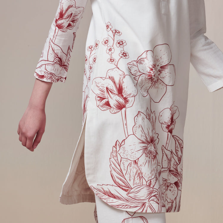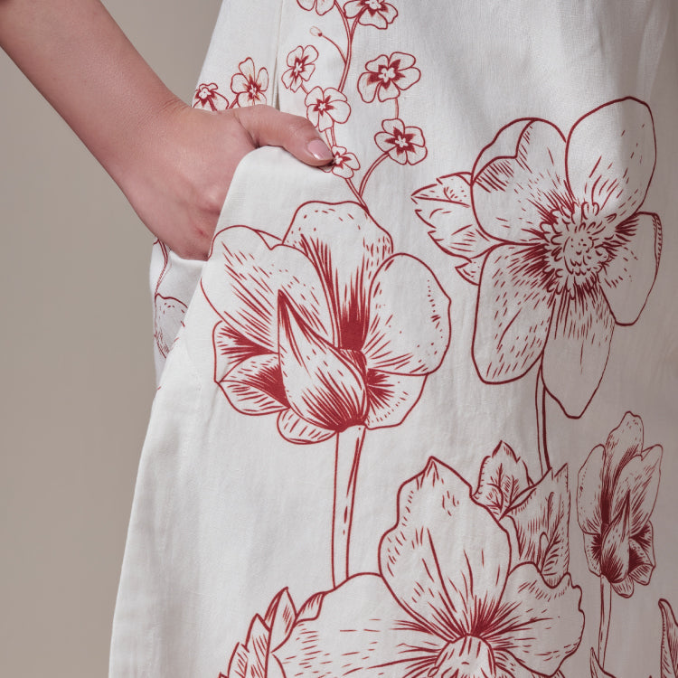 Ivory linen-cotton set with crimson florals