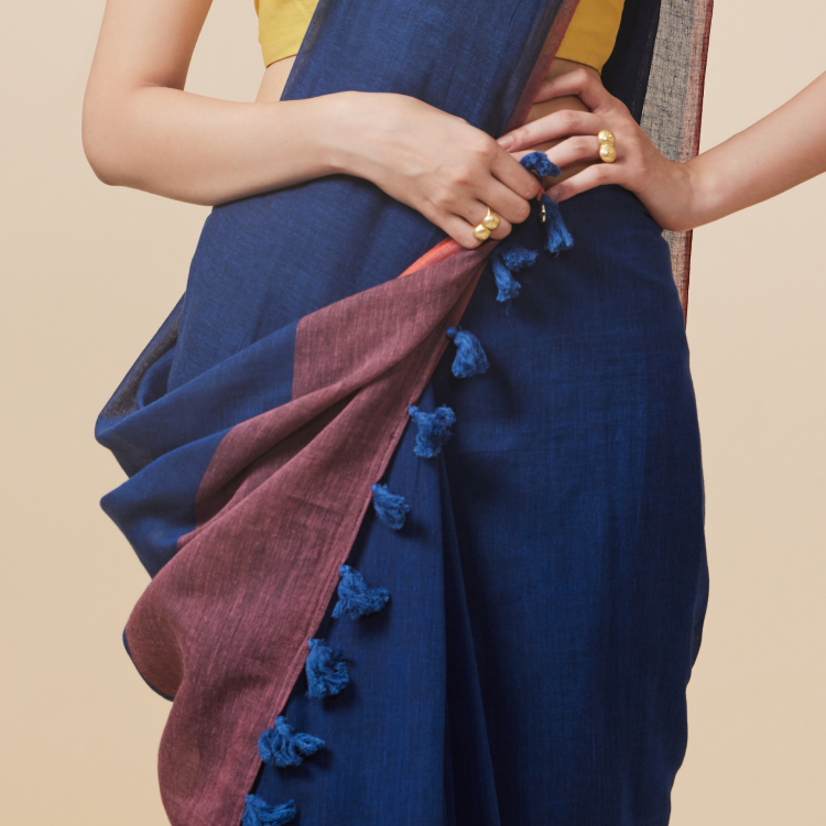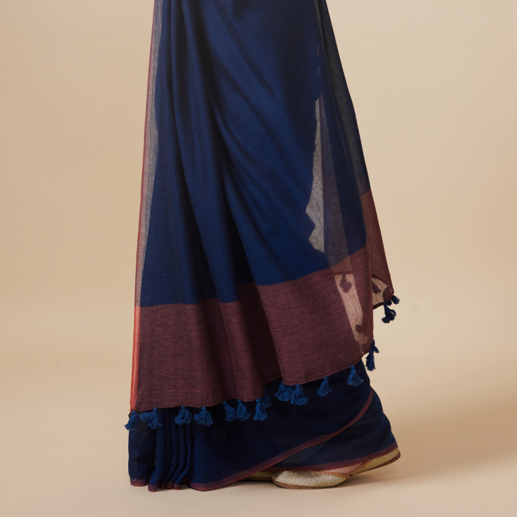 A bold and beautiful take on cotton Mulmul, the blue sapphire saree is a timeless favorite. A striking border and a contrasting palla in deep rust add to its enduring beauty.