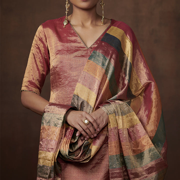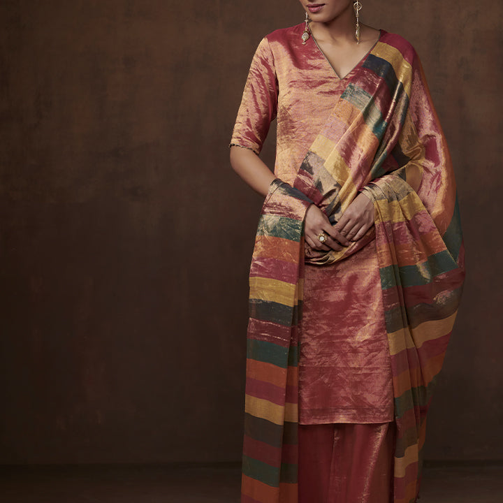 This elegant silhouette is skillfully crafted from delicate rust coloured tissue fabric. The handwoven 'Jyotirmayi Kurta and Pant' embellished with metallic accent create a graceful ensemble that complements your style.