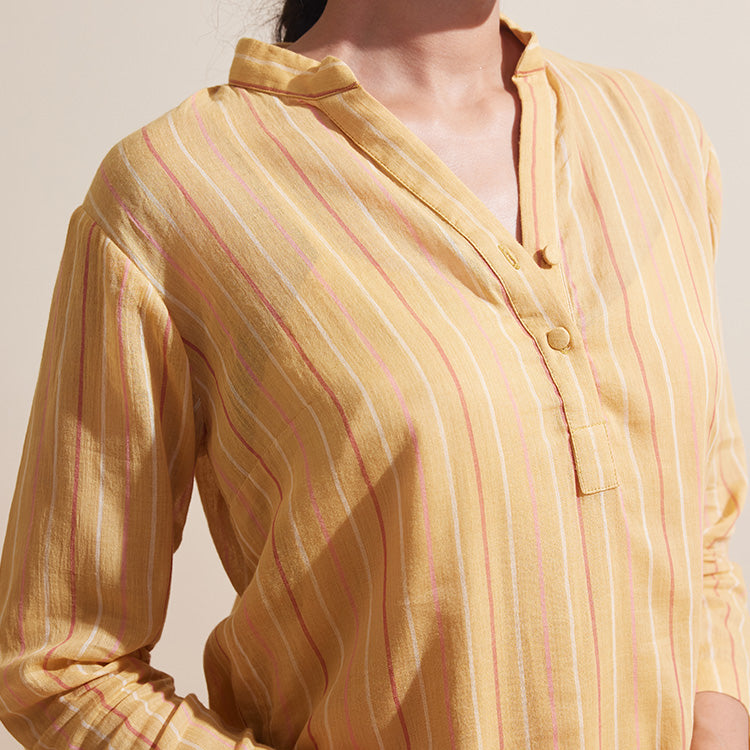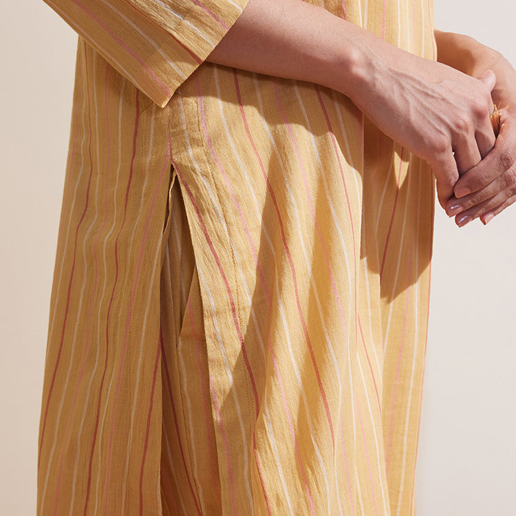 A quiet breeze captured in fabric — Kaatru features soft tonal stripes on breathable handwoven cotton, offering an elevated everyday kurta set in a warm ochre hue. Rooted in craft, the subtle patterning and relaxed silhouette make it a wardrobe essential that moves easily from day to dusk.