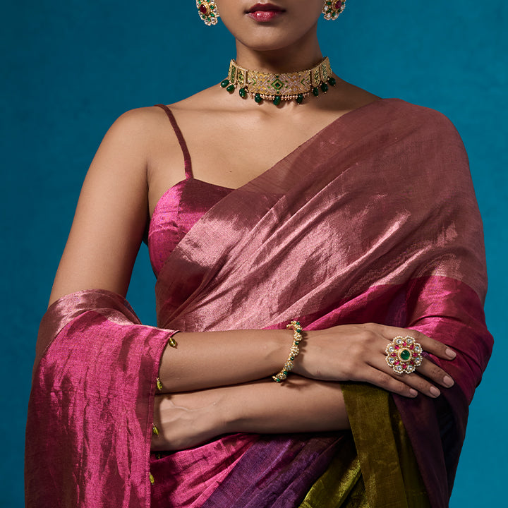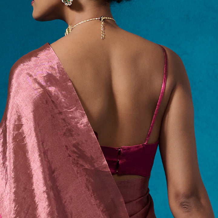 Experience the timeless beauty of daffodils with our exquisite 'Kerani' blouse. In a rich pink hue, this elegant piece features delicate spaghetti straps and intricate details and is crafted from handloom Chanderi tissue.