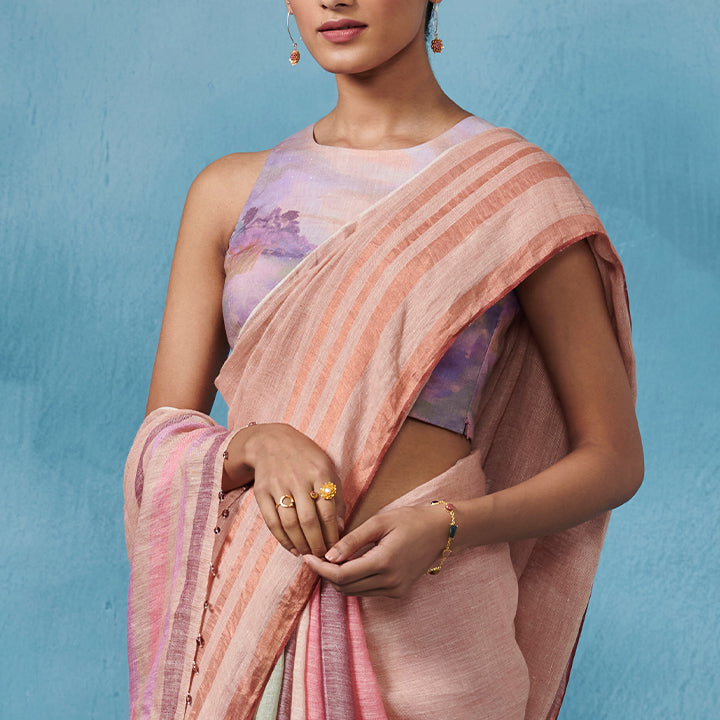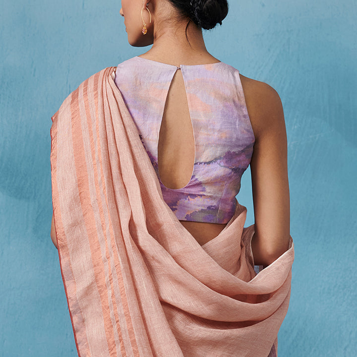 Featuring the mesmerizing beauty of lavender fields, this linen blouse is a perfect choice for a nature lover. Make a statement with this halter-neck linen blouse, styled with your favorite drape or even with your most comfortable trousers!