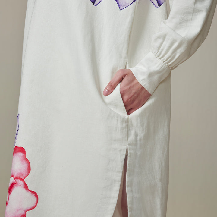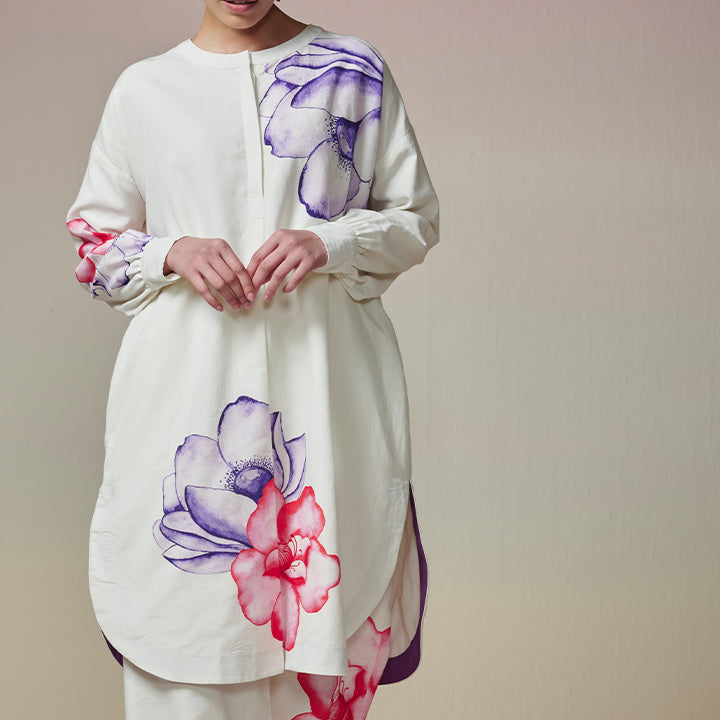 Feel the beauty of the "Lily Lane" kurta and pant set, inspired by a variety of blossoming flowers. Hand-painted and digitally transferred on Linen-cotton fabric, it effortlessly transforms from workday to holiday escapes.