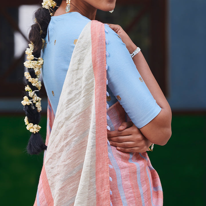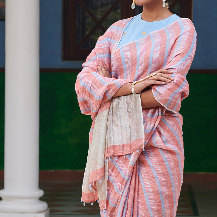 Handwoven in linen, a saree that ties together the festive hues. A modern reincarnation of classic stripes, with colours that accentuate your elegance! Drape in it for fun gatherings and treasure it for an eternity.