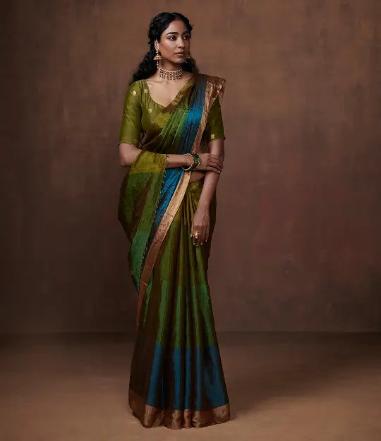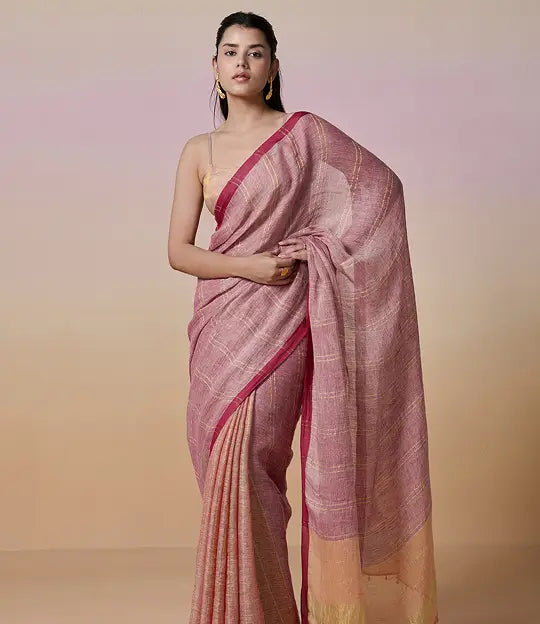 A luminous canvas of metallic checks, 'Meenamma' carries the shimmer of festivity in every thread. Woven in a palette of peach, lime, lavender, and yellow, the saree blends pastel softness with vibrant accents for a fresh, contemporary expression. Its pallu is finished with Dressfolk coins and glass beads, heightening its elegance and celebratory flair.