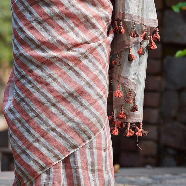 ‘Nazneen’, a handwoven Jamdani Linen Saree is the exquisite charmer. Rose pink and grey combined with silver zari details, this saree is quite an eyeful!