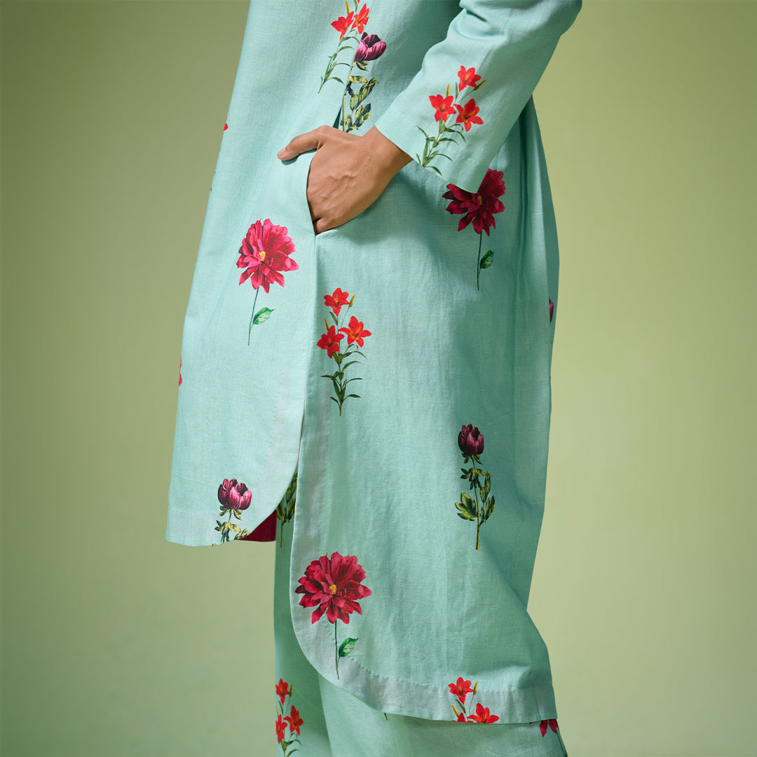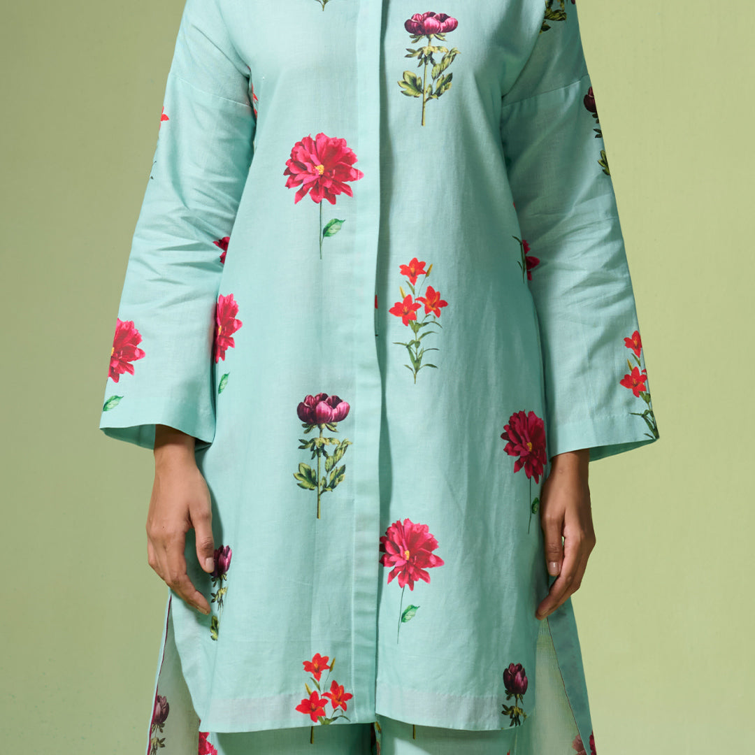 Elegant linen-cotton shirt-style set in fresh blue and pink florals