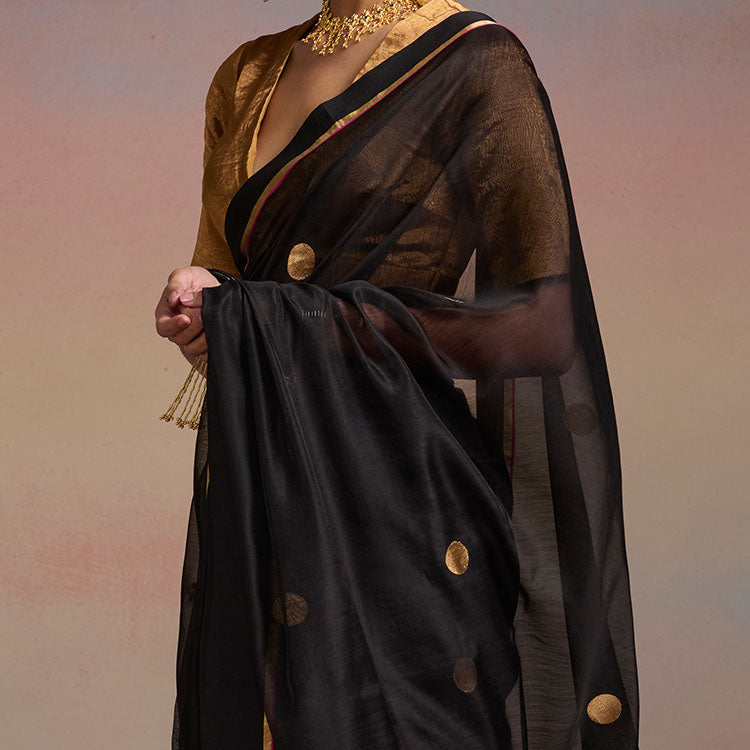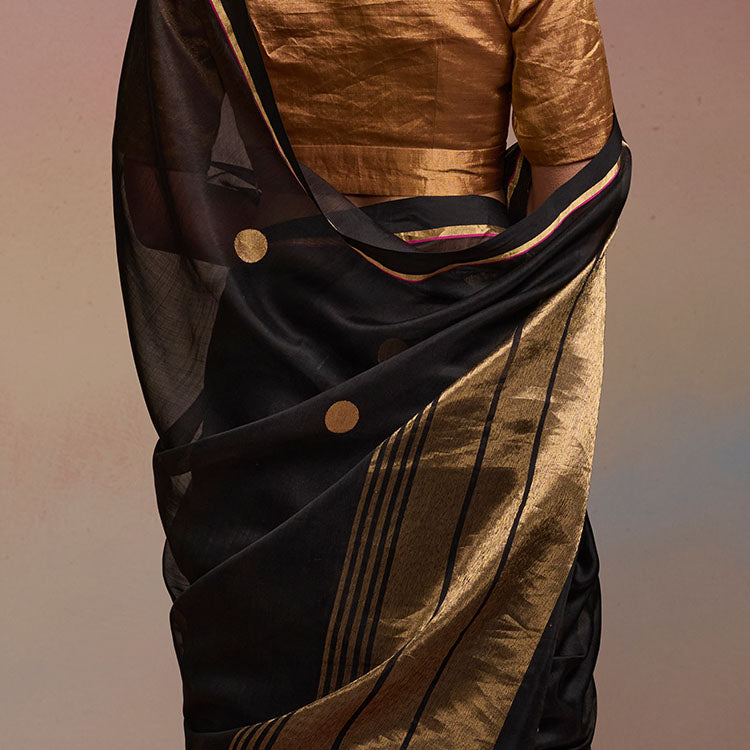 A majestic black saree adorned with intricate gold zari sikka motifs. The pink and gold border adds depth, while the pallu showcases delicate zari detailing. Perfect for weddings, celebratory evenings, and festive rituals, this saree balances sophistication with regal charm.
