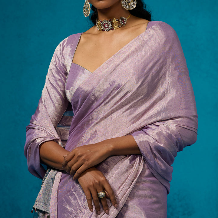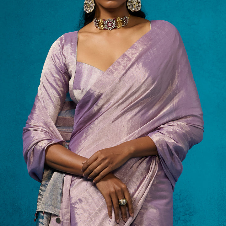 Introducing the 'Pankhuri' blouse, inspired by lavender hues. Made from rich handloom tissue with delicate silver piping, it features a stylish dori tie-up, a contemporary neckline, and a back opening for added allure.
