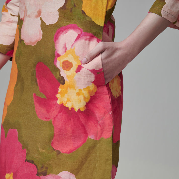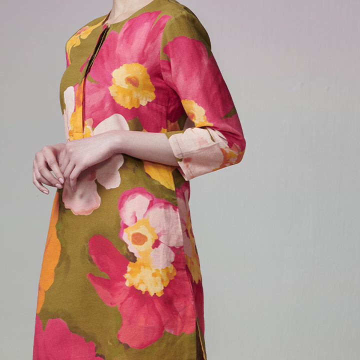 Feel the beauty of the "Petal Prism" kurta and pant set, inspired by a variety of blossoming flowers. Hand-painted and digitally transferred on Linen-cotton fabric, it effortlessly transforms from workday to holiday escapes.