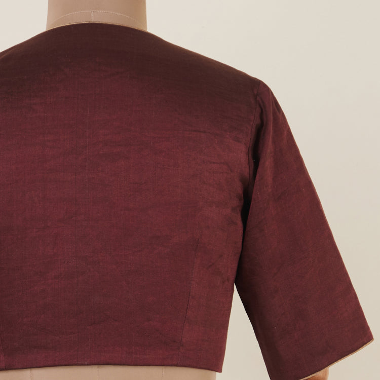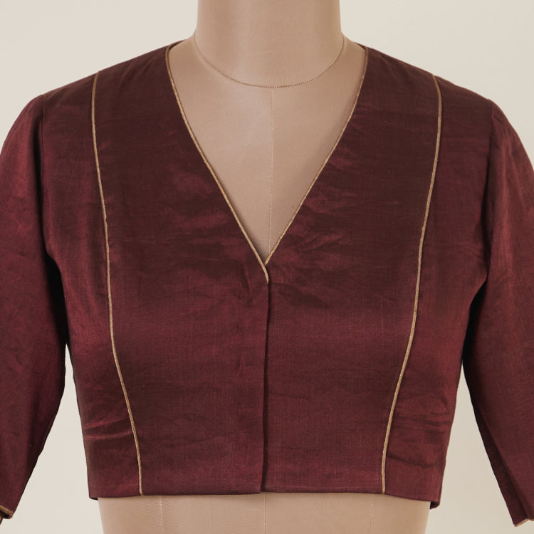 Handwoven at Chanderi, this deep maroon blouse is an effortless choice to match your charm. Adorned with the zari piping details and modest sleeves, its a perfect choice to create a subtle look perfect for any occasion.