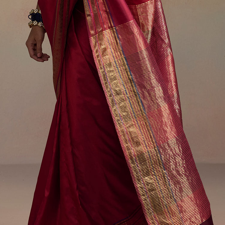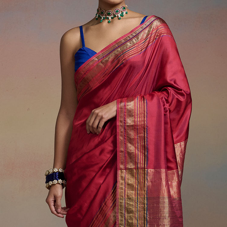 A radiant red Maheshwari silk saree with classic zari borders and subtle blue accents. The pallu features a Dressfolk signature charm and fine glass beads for authentic touch. Perfect for weddings, rituals, and celebratory events.