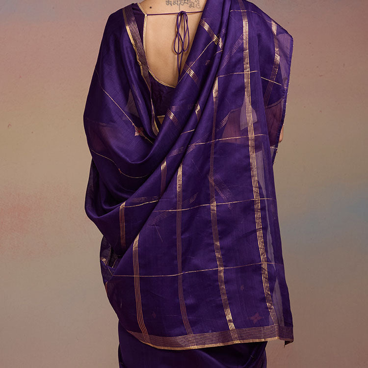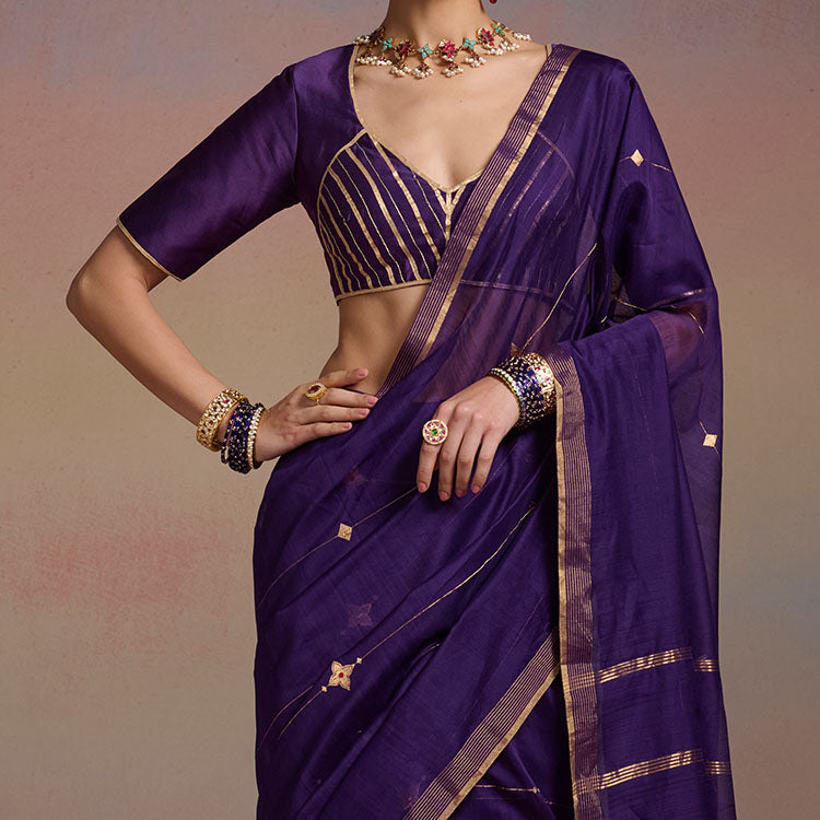 A rich purple saree adorned with fine gold zari stripes and buttas accented with red. The pallu is decorated with a Dressfolk signature charm and fine glass beads, creating a luminous, luxurious finish. Ideal for festive occasions, weddings, and celebratory evenings.