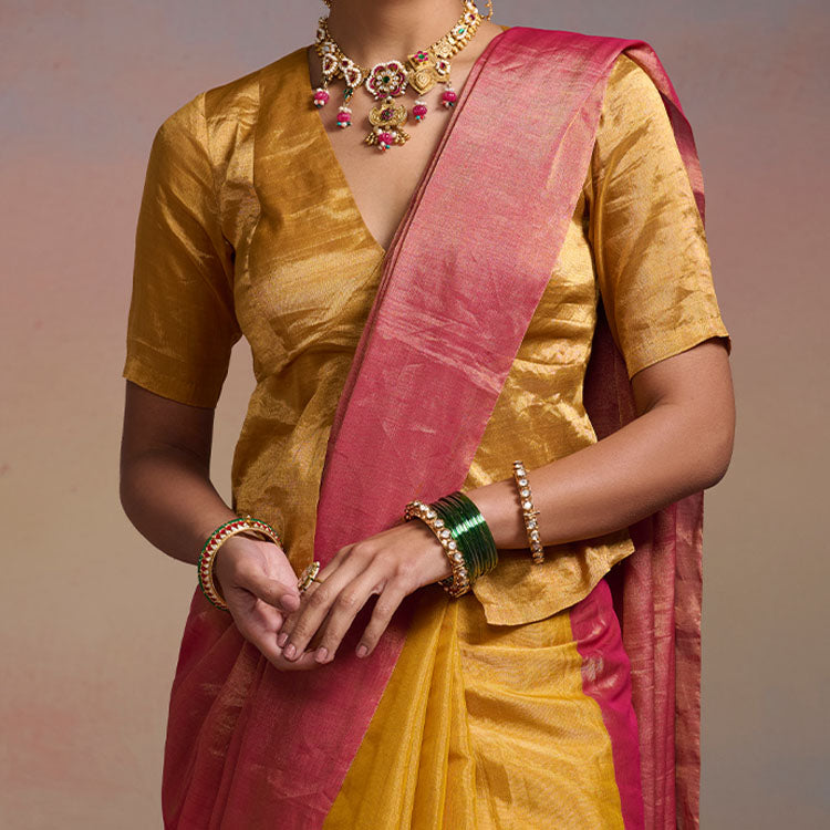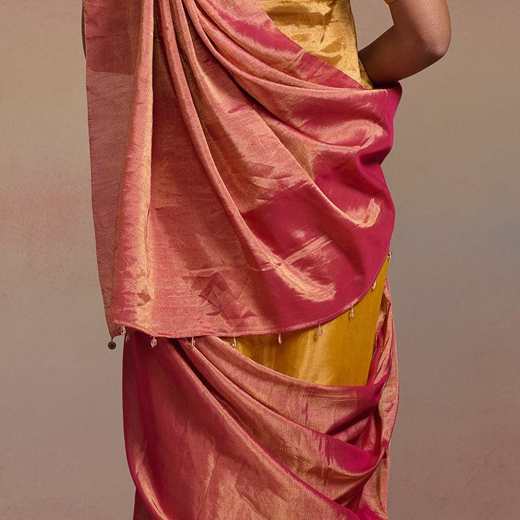 A radiant half-and-half saree in yellow gold and vibrant pink that strikes the perfect balance of warmth and brilliance. The subtle sheen of tissue makes it an exquisite choice for weddings, festive rituals, or celebratory evenings. The pallu is detailed with a Dressfolk signature charm and fine glass beads that add a luxurious, authentic touch.