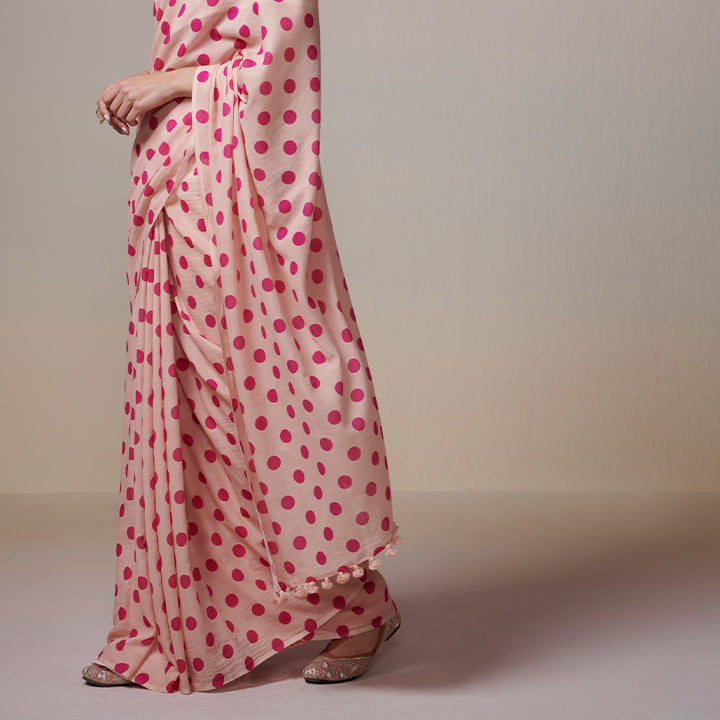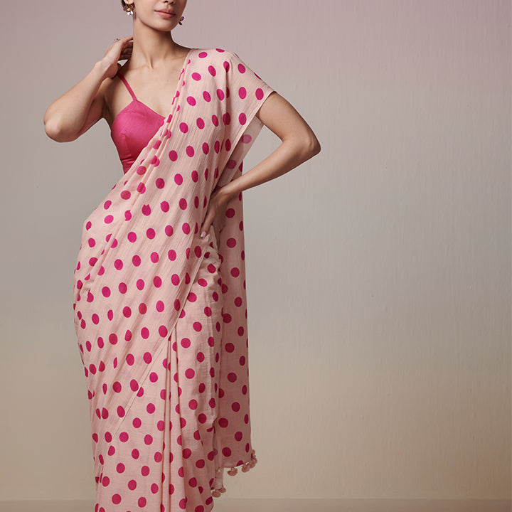 Feel the warmth of a rose field in this saree. Stand out from the crowd in this eye-catching saree with bright pink polka dots on a subtle peach handloom cotton saree.