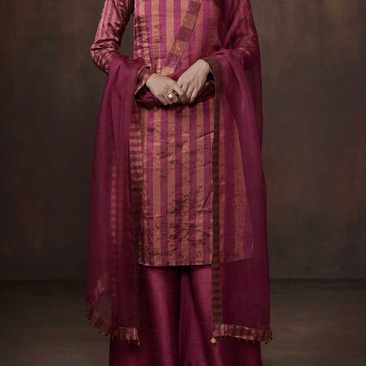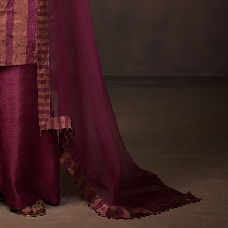 Handwoven Organza Dupatta in Magenta Pink. With striped tissue border and glass bead details; this dupatta elevates your sartorial experience.