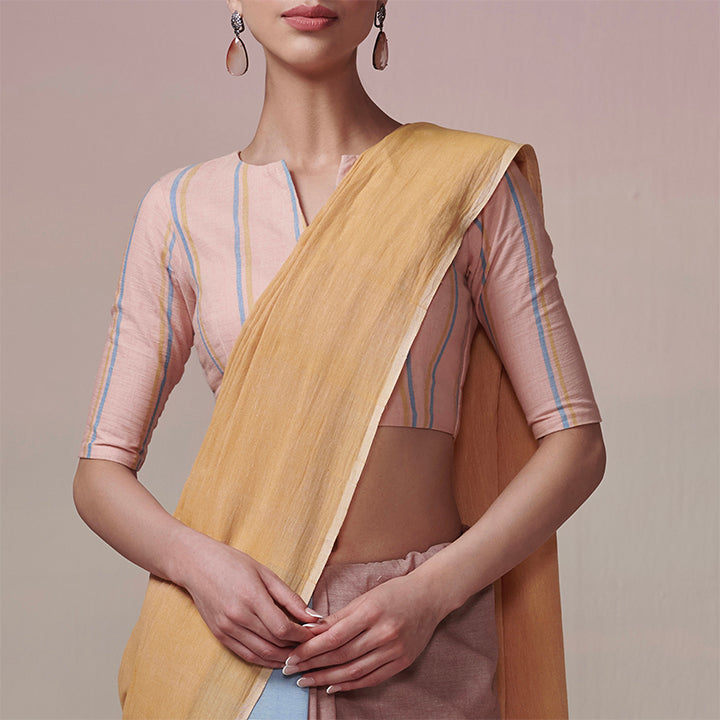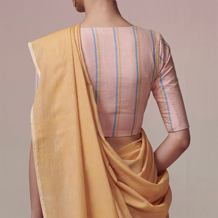 Behold our Peach Round Neck "Sarovar" Blouse, adorned with a symphony of colorful stripes meticulously woven from handloom cotton.