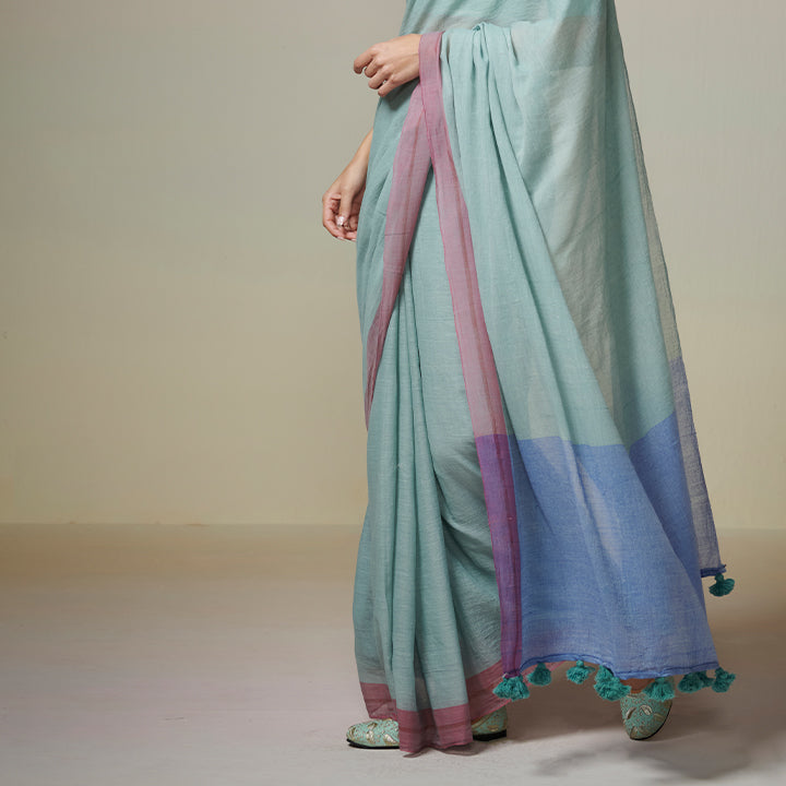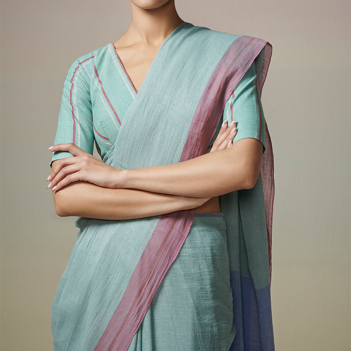 Crafted in handloom cotton, this saree mirrors a calm lake sparkling under the morning sun. This versatile saree can be styled with any of your jewelery, pair it with pearls for a day outing or silver jewelry to add bling to the look.