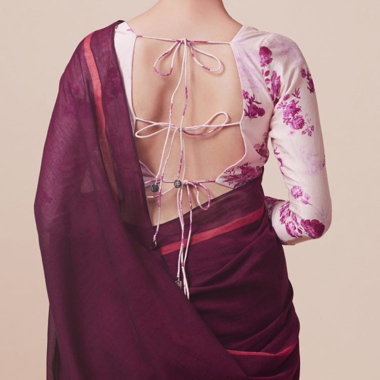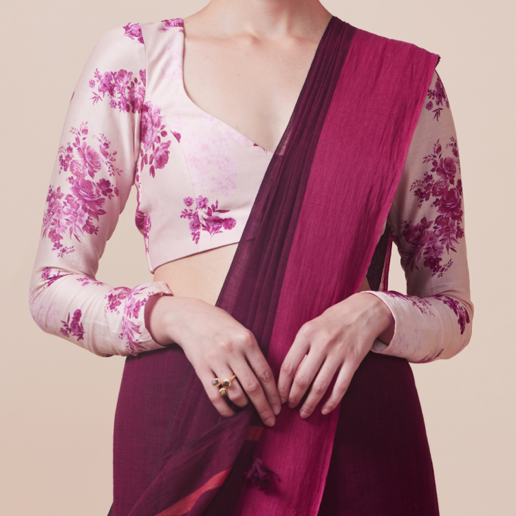 Embrace timeless elegance with Cloud Burst, a beautiful full-sleeve blouse adorned with delicate pink flowers. Crafted in handwoven Chanderi fabric, it features a dori tie-up at the back. Padded with lining and designed with a back opening, this blouse offers comfort in a modest style for any occasion.