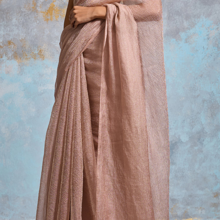Woven in a lovely pastel peach, 'Tisya' makes for a definite head-turner. Crafted on a tissue base, its lightweight fabric offers a soft and elegant drape.