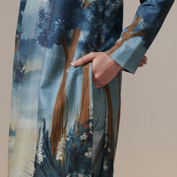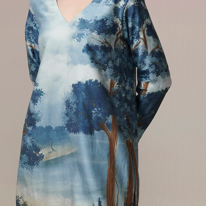 "Twilight Timber" kurta & pant set showcases the beauty of dawn which is hand painted and then digitally transferred on Chanderi fabric. Versatile with side slits and pockets, it transitions effortlessly from office to after-office hours. Pair with minimal jewellery for understated elegance.