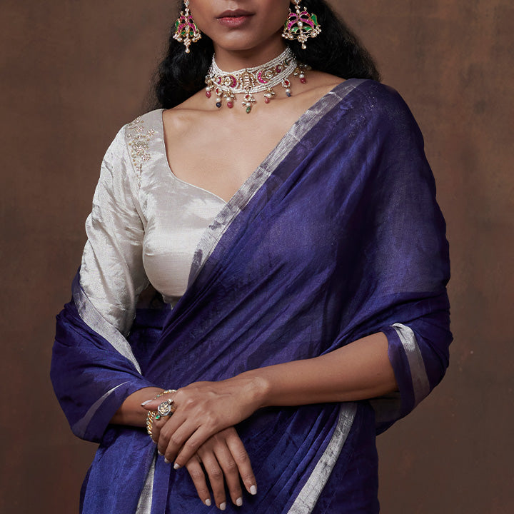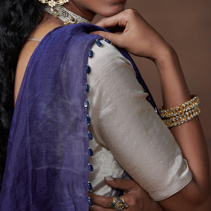 Handwoven at Chanderi, Vibha blouse can enhance your allure effortlessly with the subtle embroidery detailing on the silver color handwoven tissue fabric, making it a perfect choice suitable for any occasion.