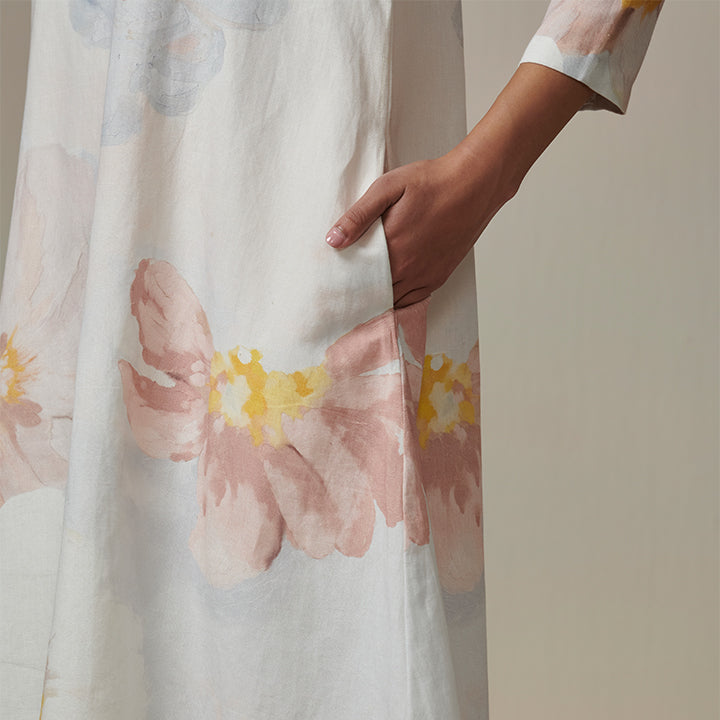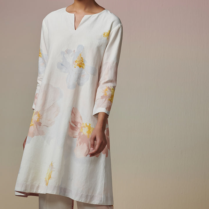 Feel the beauty of the "Whispering Fantasy" kurta and pant set, inspired by a variety of blossoming flowers. Hand-painted and digitally transferred on Linen-cotton fabric, it effortlessly transforms from workday to holiday escapes.