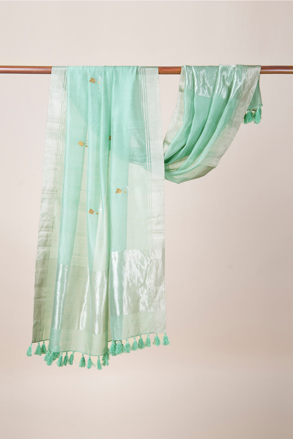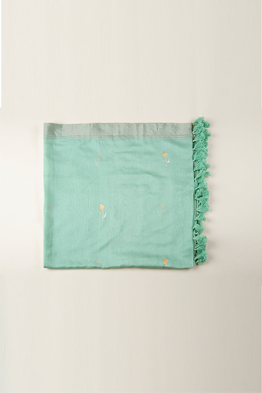 Handwoven in Chanderi, this mint dupatta is adorned with delicate tulip and bud-like motifs in traditional kadwaa technique. It is further accentuated with zari border and hand made tassels.